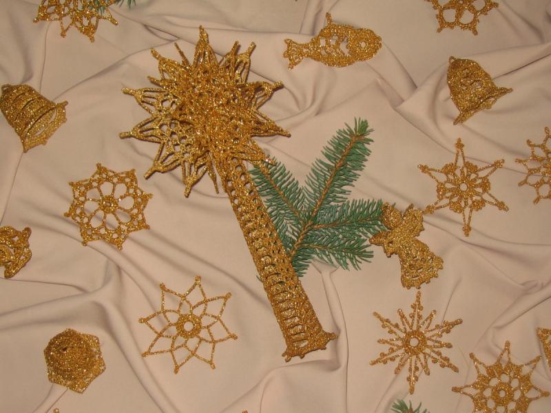 Tato sada vánočních ozdob je uháčkovaná ze zahraniční vysoce kvalitní metalizované efektní příze zlaté barvy. Všechny ozdoby jsou natužené, aby pěkně držely tvar. Můžete je použít na stromeček. Některé z nich zavěsit na větvičku, věnec, záclonu nebo jen tak položit na vánočně prostřený stůl.