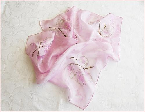 Jemný hedvábný šátek se vzorem magnolii na růžovém podkladě velikosti 55x55cm. Použity byly kvalitní barvy na hedvábí a perfektně zafixovány.