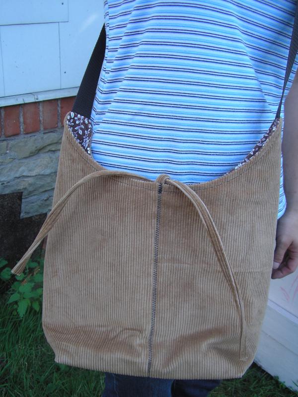 Prostoná manšestrová taška se zavazováním, vypodšívkovaná bavlnou a zpevněná ronarem. Uvnitř kapsička na suchý zip.