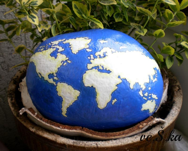 Ručně malovaný kámen s obrysy světadílů, přelakovaný bezbarvým lakem. Využití k dekoraci především v interiéru, lze i venku, ale déšť zkracuje životnost!