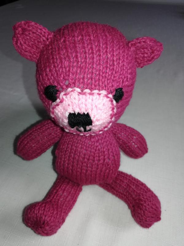 Medvídek je upleten z akrylové příze a vyplněný umělou stříží, je možné ho prát, raději opatrně ručně. Oči a čumáček jsou vyšité. Vysoký je cca 25cm. V jeho šatníku je sukýnka s laclem, svetřík a čepice s bambulí.