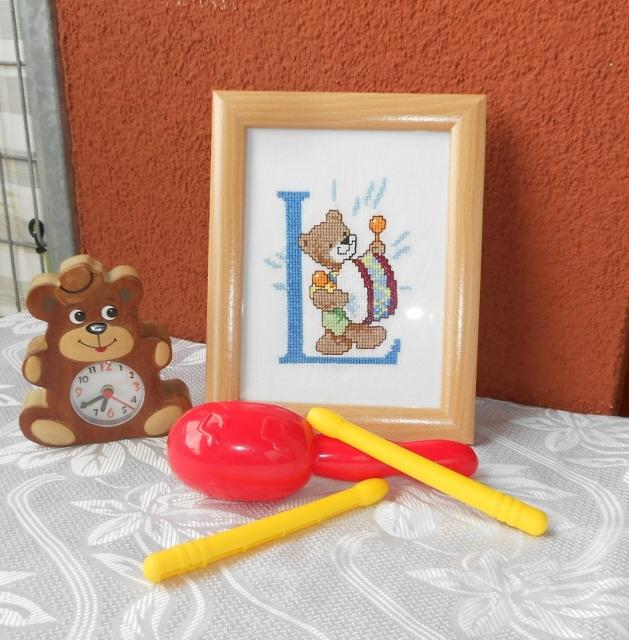 Medvědí bubeník bude krásnou dekorací nejenom pro všechny kluky. Obrázek je vyšitý křížkovým stehem a zarámovaný v dřevěném fotorámečku.