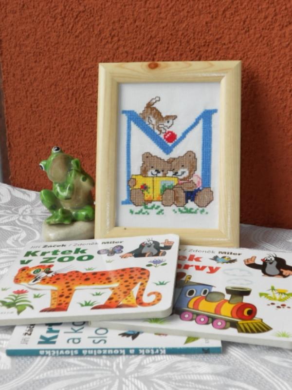 Medvědí čtenáři krásně doplní knihovničku větších i mladších… Obrázek je vyšitý křížkovým stehem a zarámovaný v dřevěném fotorámečku.