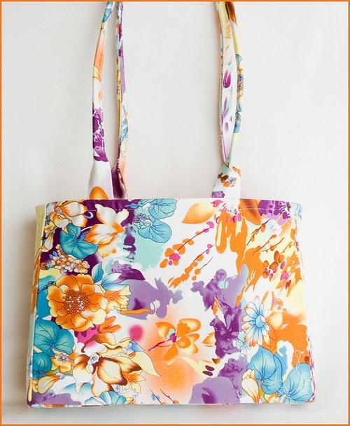 Krásná kabelka z bavlněné dovozové látky s malou příměsí elastanu, podšívkovaná meruňkovou bavlněnou látkou s dvěma dělenými kapsami lemovanými svrchní látkou. Podšívka obsahuje též všitý pásek na klíče.