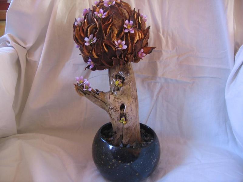 Nádherný stromeček z hnědých uschlých lístků protkaný jemnými fialovými kvítky.Na kmeni vykukují z děr na kmeni dva ptáčci v barvách květinek. Výška 32cm.