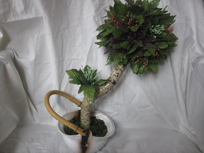 Tmavě zelený stromeček s decentními prvky v korunce na bílém březovém kmeni posazený ve zvláštním košíčkovém květináčku s ouškem. Výška 34cm.
