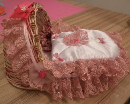 Mini postýlka vyrobená s pedigu, ozdobená růžovozlatou krajkou.