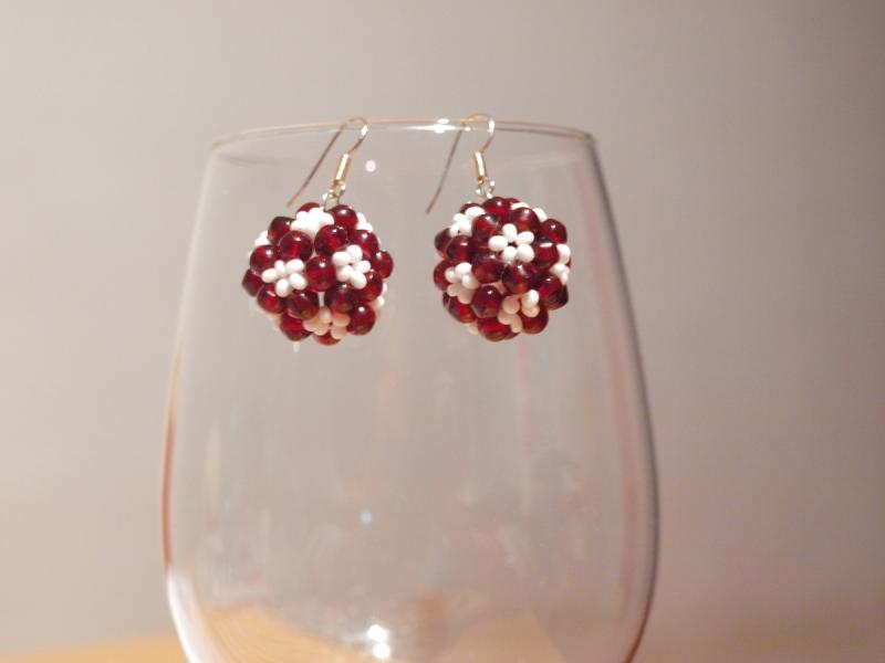 Šité naušničky z rokajlových korálků různých velikostí v barvě bílé a tmavě vínové. Průměr kuličky je 2 cm.