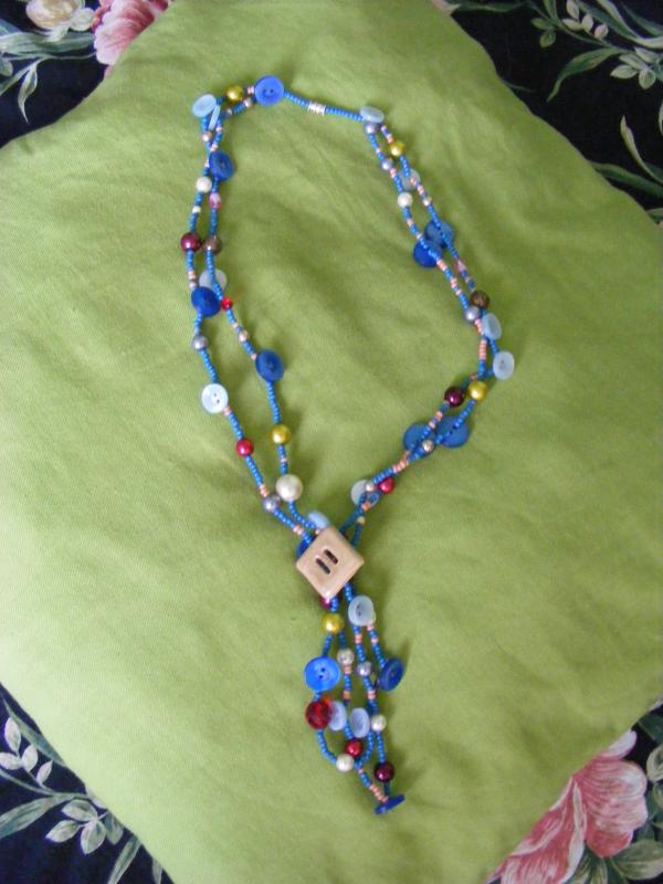 Náhrdelník je vyroben z modrých a světle růžových rokajlů, které jsou doplněny různobarevnými perličkami a modrými knoflíky. Je dvouřadý a dlouhý cca 40 cm.