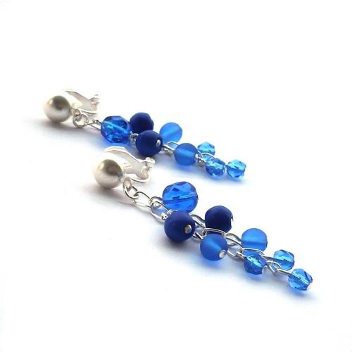 Náušnice jsou z mdorých skleněných korálků, které jsou uspořádané do jemného hrozínku.