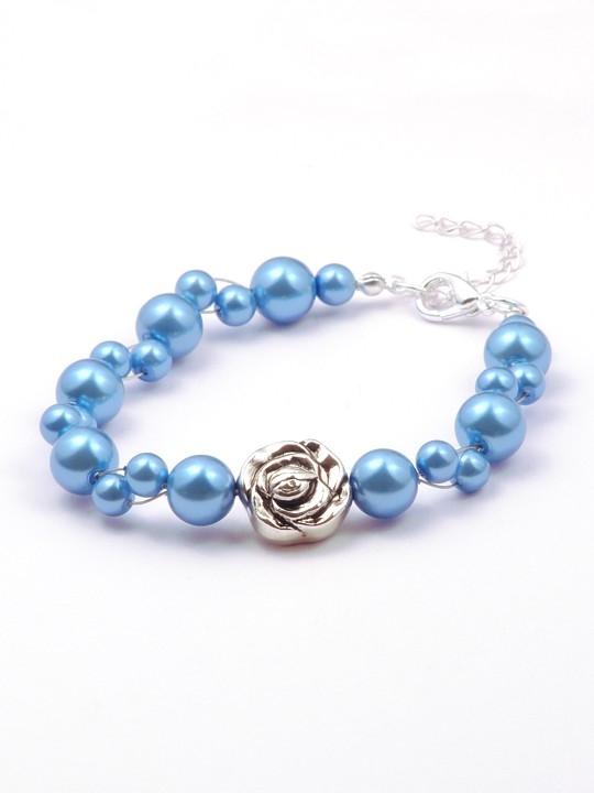 Náramek z modrých bižuterních korálků v matu a pokovaného korálku ve tvaru růže -ve dvou velikostech