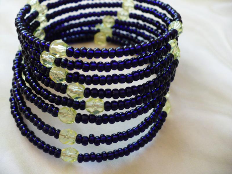 Náramek je vyroben z kvalitního českého rokailu zn. Preciosa barvy modré a českých skleněných korálků . Navlečeném na paměťovém drátu. 8 otoček průměr 7 cm, šířka 4 cm
