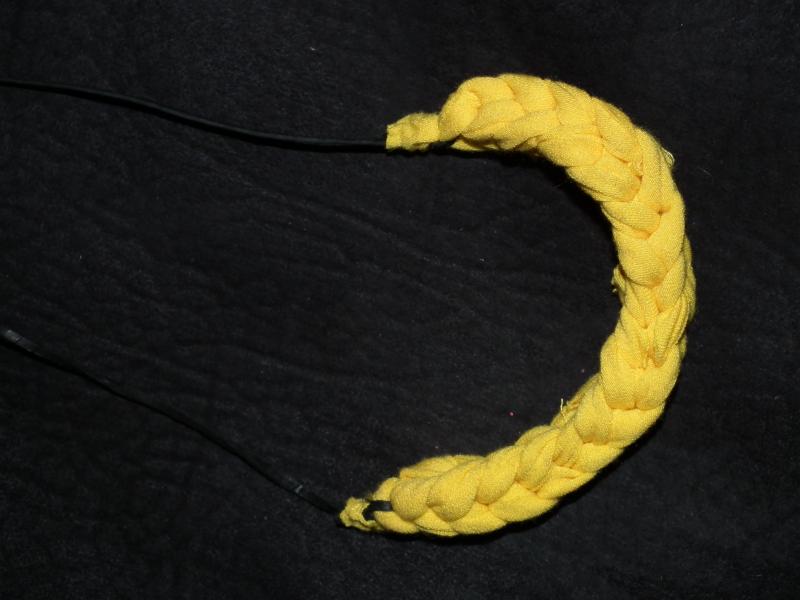 Žlutá ozdoba na krk, spletena na prstech ze zbytků látky, doplněna černou kůžičkou. Délka 56 cm, je