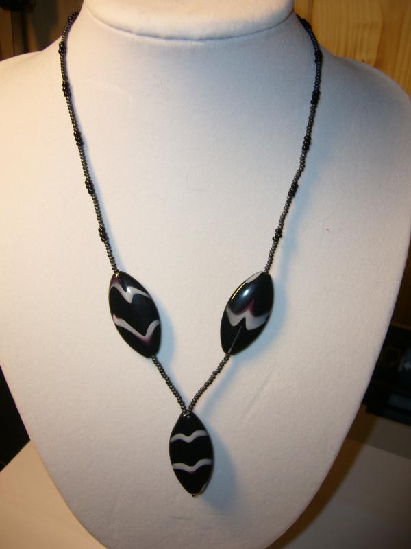 Korálky jsou skleněné. Barva černá s žíháním do bíla.