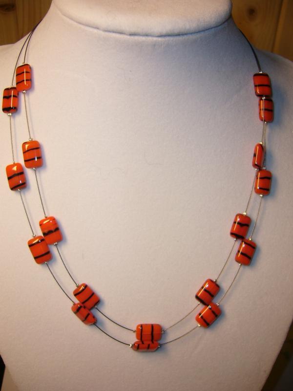 Barva korálově červená s černým zdobením, velokost korálků 1 cm.