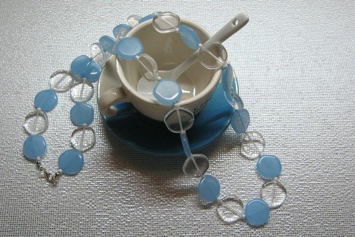 Náhrdelník na vlasci. Zapínání karabinka. Délka 78 cm. Materiál: sklo, rokajl