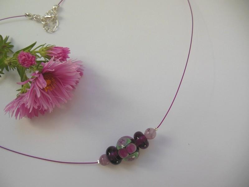Jemný náhrdelník s fialovozelenou vinutkou a fialovými rondelkami na lanku stejné barvy se zapínáním na karabinku. Autorská vinutka.
