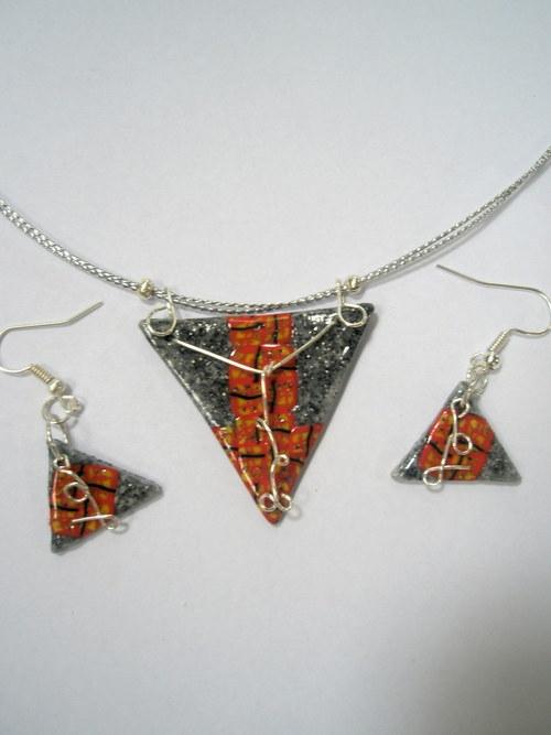Náhrdelník s fimo hmoty lakovaný,zdobený postříbřeným drátkem,zavěšený na kovovém provázku.Naušnice taktéž zdobené postříbřeným drátkem a zavěšen na postř.afroháčku