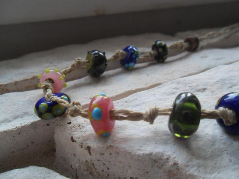 Korálky jsou navlečeny na provázku a odděleny uzlíkama, korálky jsou různě veliké a každý je jinak zdobený.