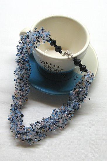 Háčkovaný náhrdelník na vlasci, doplněný skleněnými korálky. Zapínání karabinka. Délka 49 cm. Materiál rokajl, sklo