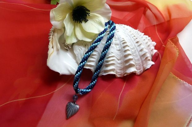 Kumihimo náhrdelník s přívěškem. Zapínání karabinka. Délka 50 cm. Materiál: satén, sklo, imitace kovu, rokajl