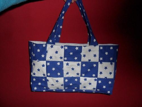 Kabelka je bavlněná, podšitá bílou podšívkou na které je našita vnitřní kapsa,kapsa je prositá modrobíle.