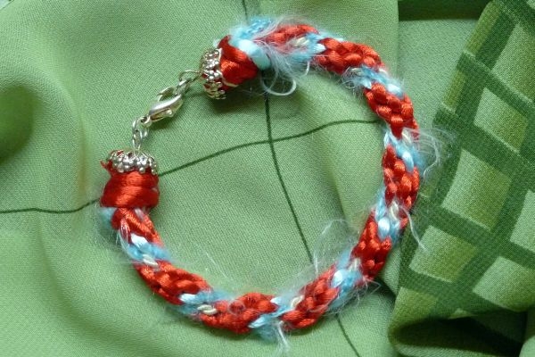 Kumihimo náramek. Zapínání karabinka. Délka 19 cm. Materiál satén, vlna, kroucená šňůrka