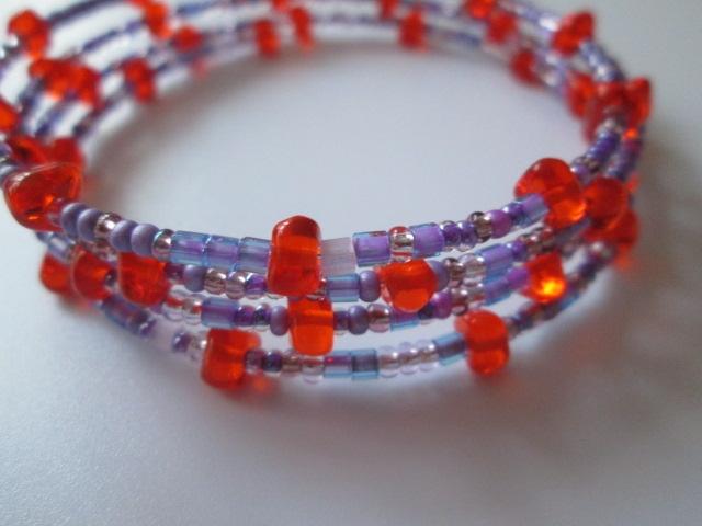 Náramek na paměťovém drátku Ručně navlečený náramek ze skleněných korálků na paměťovém drátku o průměru 6 cm.Náramek se nasazuje namotáním na zápěstí.Barva fialový mix a oranžová.