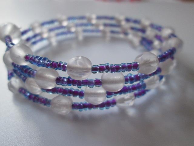 Ručně navlečený náramek ze skleněných korálků na paměťovém drátku o průměru 6 cm.Náramek se nasazuje namotáním na zápěstí.Půsvitná fialová a bílá barva.