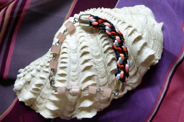 Kumihimo náramek s korálky. Zapínání karabinka. Délka 20cm. Materiál satén, kroucená šňůrka, sklo