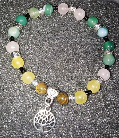 Ledový zelený achát je kamenem uzemnění a rovnováhy těla, mysli i ducha.Citrín-je uctíván jako kámen slunce.Tygří oko-posiluje odvahu a psychickou harmonii.Růženín je kamenem lásky a krásy.