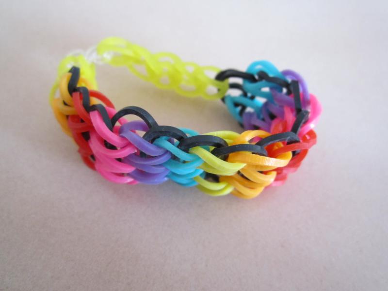 Náramek je vyrobený z gumiček Loom bands v barvách modré, oranžové a fialové, růžové, červené a žluté. Možnost vyrobit v jakýkoliv barvách 🙂