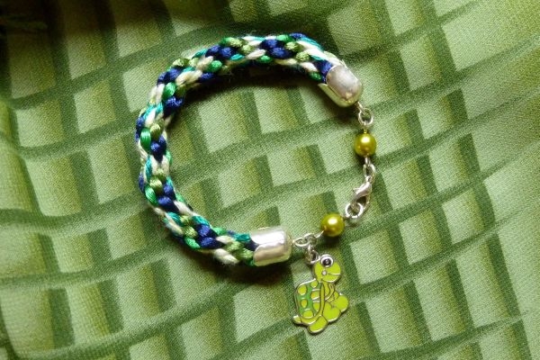 Kumihimo náramek s přívěškem. Zapínání karabinka. Délka 20 cm. Materiál: satén, vlna, příze, smalt, voskové perly.