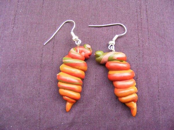 Náušnice jsou vyrobené ze zelené, červené a sv. hnědé fimo hmoty, zakončené stříbrným afro háčkem. Délka (včetně háčku) je cca 5,5 cm
