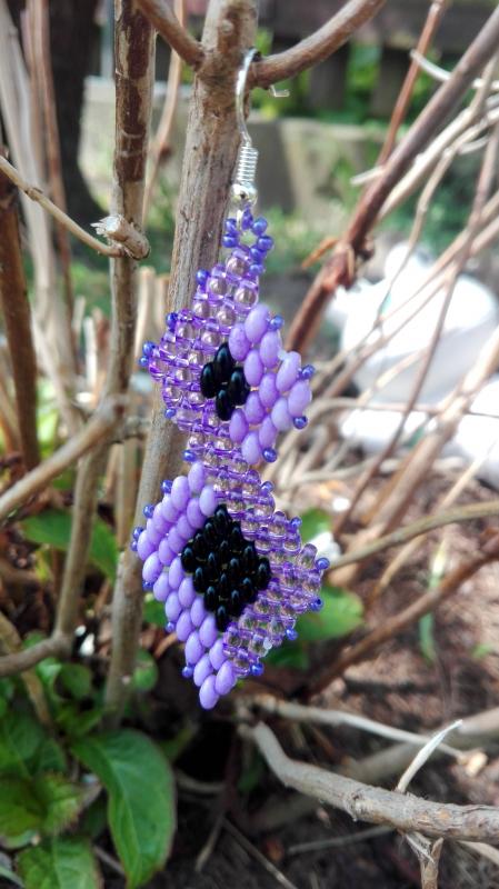 Elegantní 7 cm dlouhé naušnice v fialovočerném provedení. Použity twiny a rokail .
