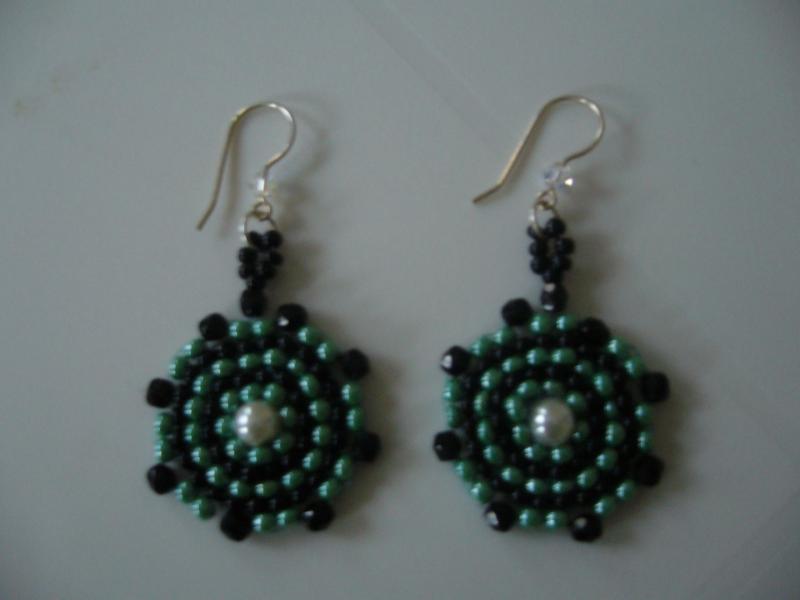 Site zelene nausnice z rokajlu a cernych brousenych perel, ozdobene uprostred bilou perlou.Afrohacky je mozne po domluve vymenit za protialergicke hacky z chirurgicke oceli.Samozřejmostí jsou gumové zarážky.