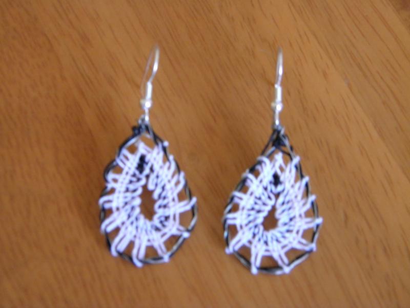 Ručně paličkované naušnice ve tvaru slziček a barvě černobílé. Výška náušnice cca 5cm včetně afroháčku. Po obvodu je přidaný drátek z důvodu lepšího udržení tvaru. Po dohodě lze vyrobit také v jiné barevné kombinaci nebo bez drátku.