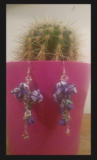 bílo-fialové naušnice, fimo kvítky doplněné kovovými korálky. Délka cca 7cm