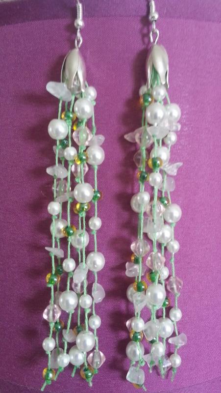 Naušnice Jarní zvonky- dlouhé naušnice cca 10cm, perličky v barvách bílá, růžová, světle zelená,kombinované s růženínem