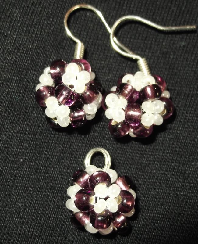 Ručně vyrobené naušnice s přívěskem, vhodné i do společnosti. Fialovo – bílá malá kulička. Možné osobní předání v Chomutově či Jirkově. Cena bez dopravy.