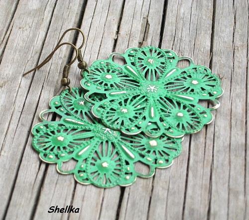 Náušnice jsou vyrobeny ze starobronzových filigránů(48mm).Jsou ručně napatinované zelenou patinou na kov.Používám kvalitní patinu,nikoliv akrylovou barvu jako náhražku patiny!!!Vrchní vrstva patiny byla záměrně setřena,aby vynikla nerovnost a ornament na kovu.Komponenty jsou bronzové,plastová zarážka bude dodána.