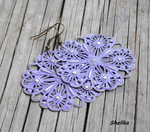 Náušnice jsou vyrobeny ze starobronzových filigránů(48mm).Jsou ručně napatinované světle fialovou patinou na kov.Používám kvalitní patinu,nikoliv akrylovou barvu jako náhražku patiny!!!Vrchní vrstva patiny byla záměrně setřena,aby vynikla nerovnost a ornament na kovu.Komponenty jsou bronzové,plastová zarážka bude dodána.