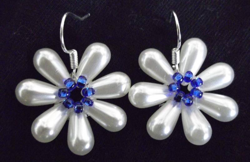 Ručně vyrobené, elegantní naušnice, vhodné i do společnosti. Bílé s modrým středem. Možné osobní předání v Chomutově či Jirkově. Cena bez dopravy.
