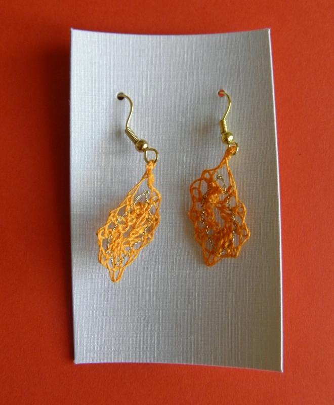 Ručně paličkované náušnice ve tvaru oválu s použitím oranžové lněné příze a zlaté. Výška 4cm včetně zlatého afroháčku. Možnost zhotovit i v jiné barevné kombinaci.
