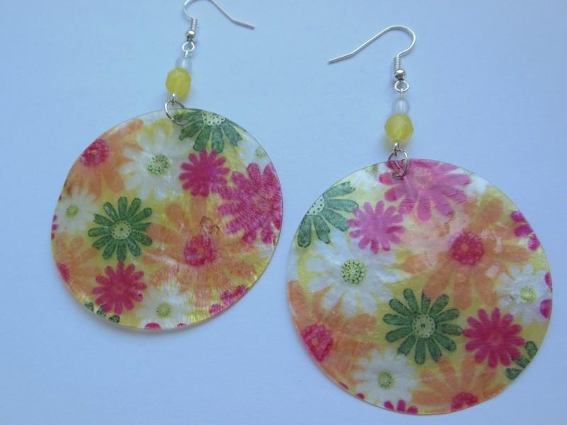Náušnice – perleťové placky, skleněné korálky, komponenty starostříbro. Délka bez zapínání 6,5 cm.
