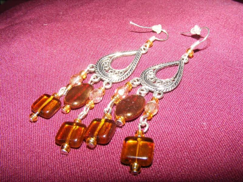 Náušnice jsou vyrobené z hnědých a světle růžových korálku, doplněné postříbřenou slzičkou. Délka cca 6 cm
