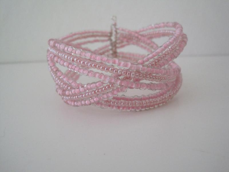 Propletaný něžně růžový náramek, vyrobený z rokajlu na paměť.drátku o průměru 6cm. Pevný, pěkně vypadá na ruce, široký cca 3cm.