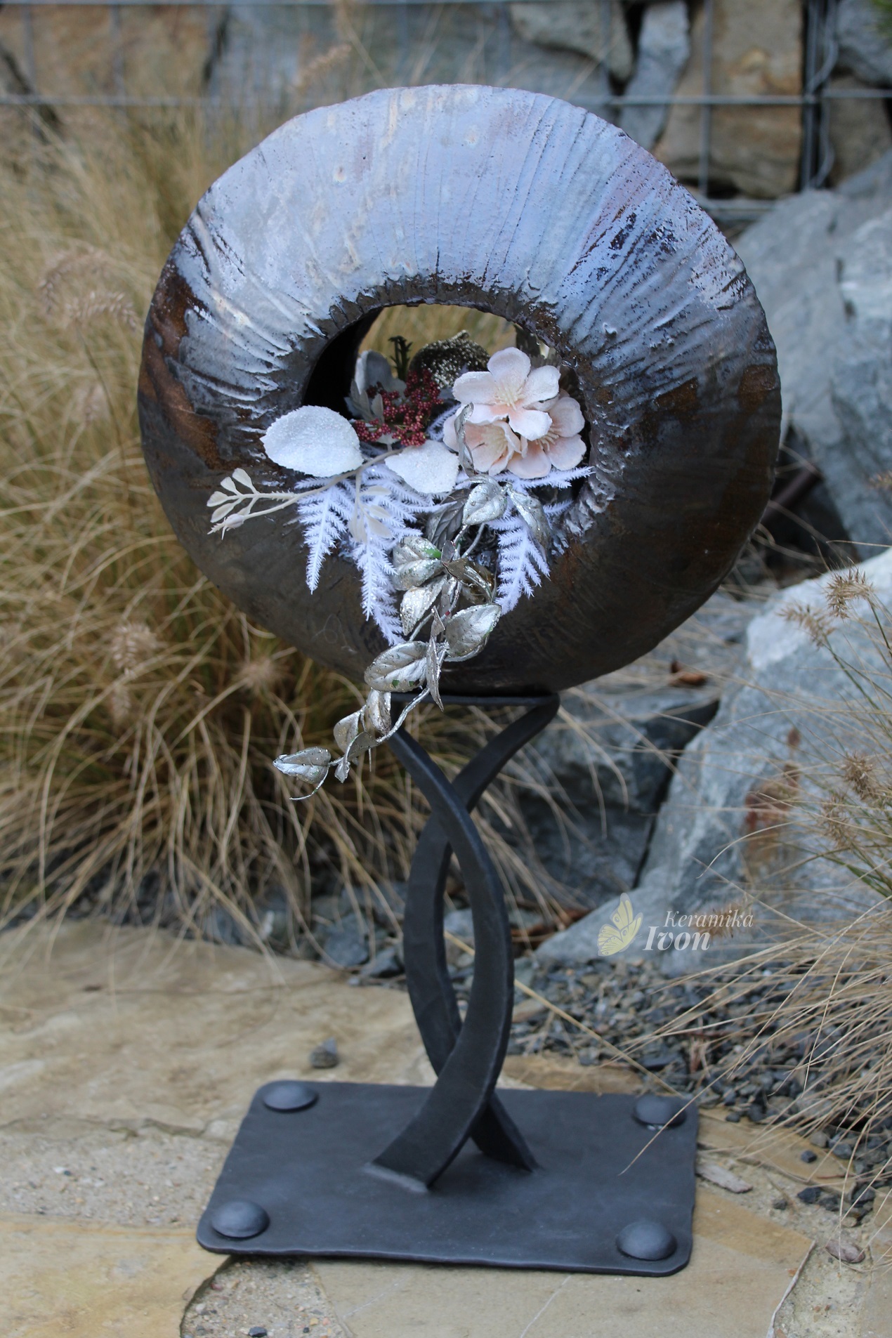 <p>Ručně modelovaný a dekorovaný obal na květiny na kované nožce.</p>