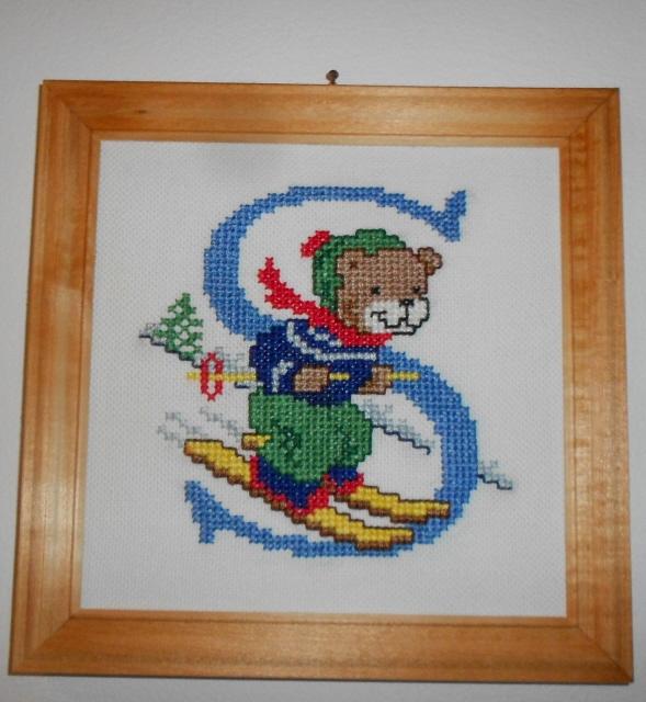 Medvídek vyšitý křížkovým stehem stálobarevnými bavlnkami. K pověšení na zeď.