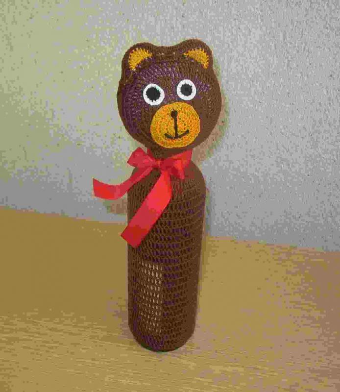 Jste pozvaní na oslavu? a přemýšlíte a nevíte? tady je jeden TIP! Ozdoba zůstává i po vyprázdnění obsahu 🙂 Háčkovaná ozdoba na láhev – medvídek – vhodné k jakékoliv příležitosti. Tato ozdoba je vyrobena na láhev s průměrem 6-7cm výška láhve cca 30cm. Láhev není součástí zboží.  Ozdobu uháčkuji na láhev dle vašeho přání. Dodací lhůta dle vytíženosti, aktuální informace poštou.